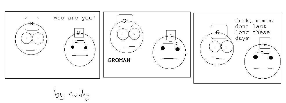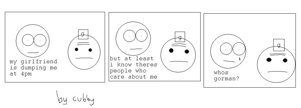 Here is where you will find everything you need to know about Gorman. ::Who is Gorman?:: Gorman is loosely based on both the character from Aliens, a funeral home worker and a strange section of text from Urban Dictionary, and fleshed out by the crew of EG. Jones is his boss. Casper The Friendly Ghost is his ex-workmate. He's also Gordon freeman's underacheiving lab technician brother. ::When did he appear?:: He materialised in a thread by Casper_Esq. About being dumped by his girlfriend. ::What's so great about him?:: He is associated with the EG term: Urnwank. SquareJawHero brought him to life. |